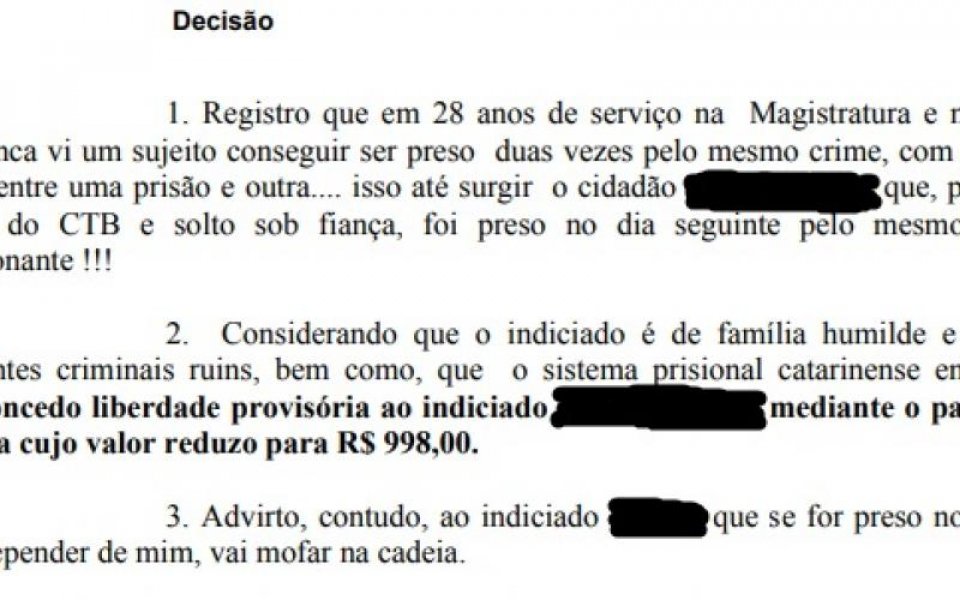 Depois de considerar a origem humilde do preso e a ausência de antecedentes criminais “ruins”, ele destaca que o sistema prisional catarinense encontra-se “falido”. Por esses três motivos, o magistrado concedeu a liberdade provisória mediante pagamento de fiança de R$ 998.