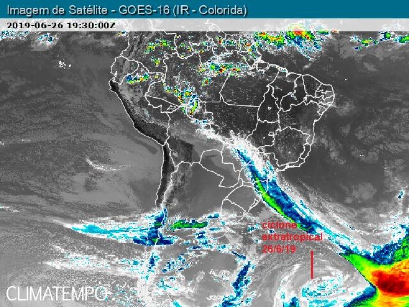 A primeira agitação marítima na costa do Sul e do Sudeste do Brasil ocorre durante os dias 27 e 28 de junho, causada por ciclone extratropical que já está afastado em alto-mar.