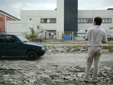 Outro caso grave foi registrado em Jaguaruna. Cristiano Cardoso, 35 anos, caiu do telhado e bateu em um muro. Ele teve traumatismo craniano e de coluna. Ele tinha subido no telhado para arrumar as telhas que tinham caído com os ventos. Os bombeiros voluntários de Jaguaruna levaram o homem para o HNSC, em estado grave.