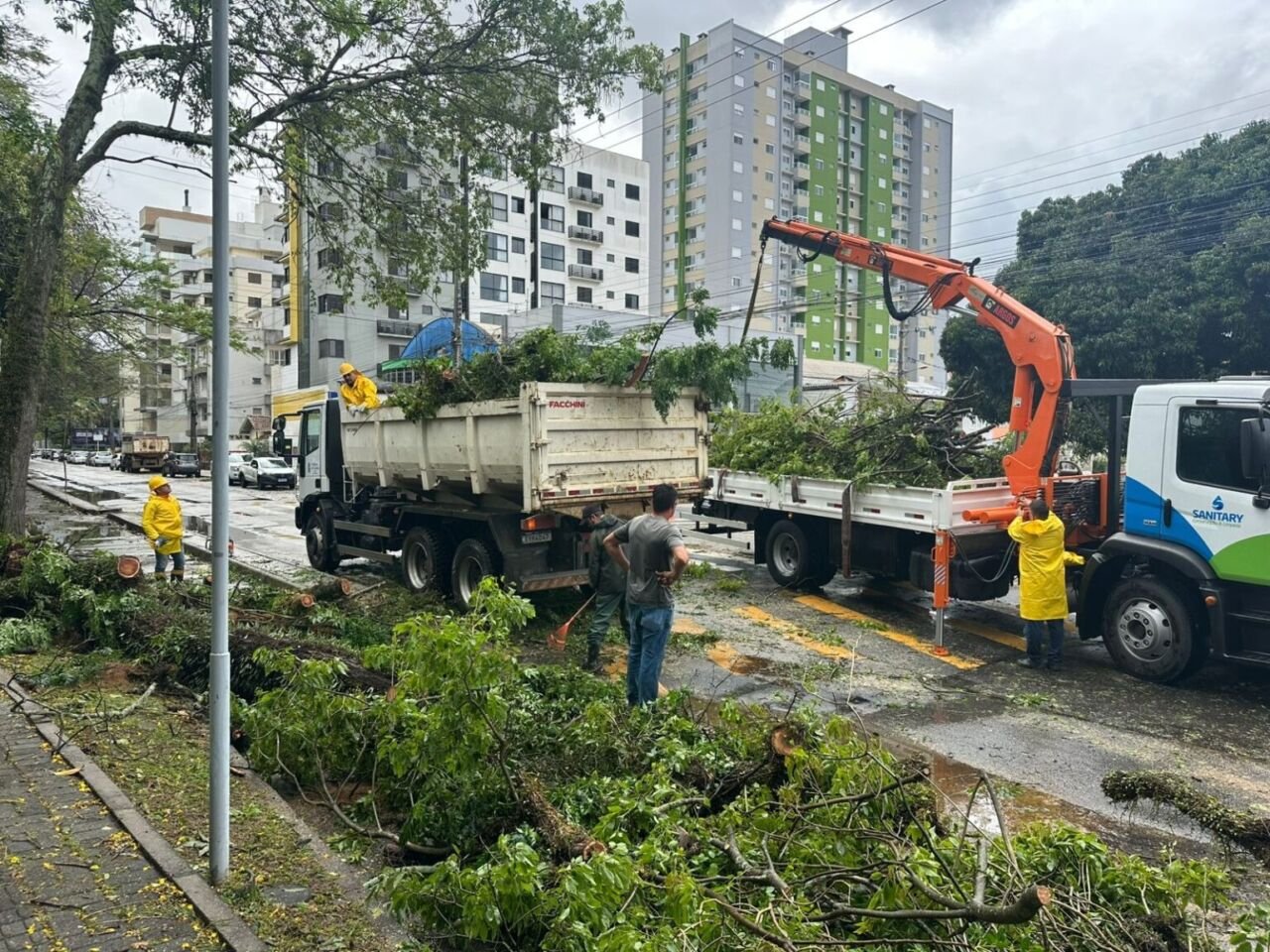 As equipes da Defesa Civil registraram quedas de árvores em diferentes pontos, inclusive de grande porte, nas avenidas Getúlio Vargas (interditada temporariamente para remoção) e José Acácio Moreira, além de ocorrências no bairro Dehon (via estreita) e monitoramento de árvore com risco de queda no bairro São Martinho.