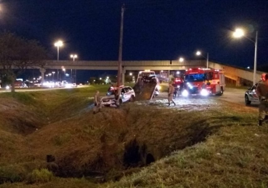 Uma viatura da Polícia Militar capotou durante uma perseguição na Via Expressa (BR-282), em Florianópolis, por volta das 5h30 desta quarta-feira (1°). Três policiais estavam dentro do carro quando aconteceu o acidente. Dois deles sofreram apenas escoriações, enquanto que o outro foi encaminhado para um hospital.