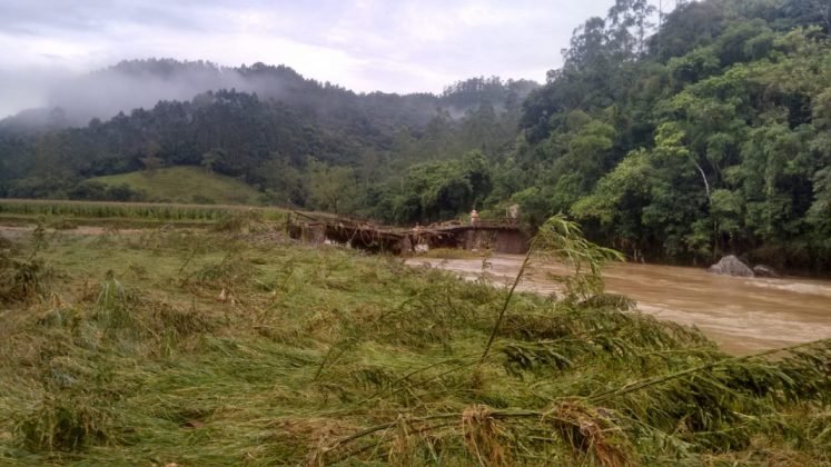 A ponte que liga Grão-Pará a Rio Fortuna com quase 15 metros de comprimento foi levada pelas águas.